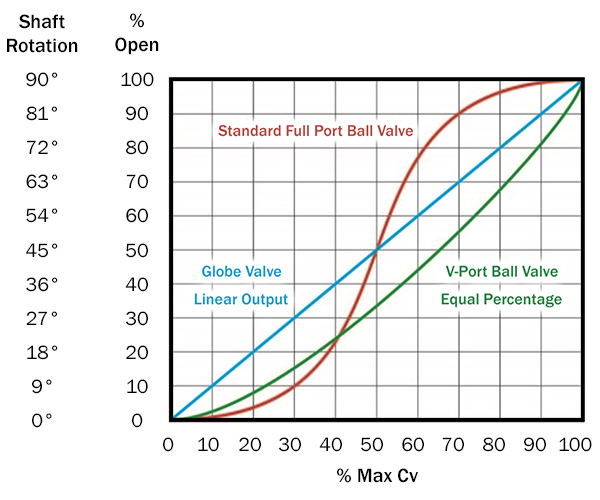 This table demonstrates the rate of valve opening according to the rotation of the shaft. It also represents the control precision differences between ball valves and globe valves.