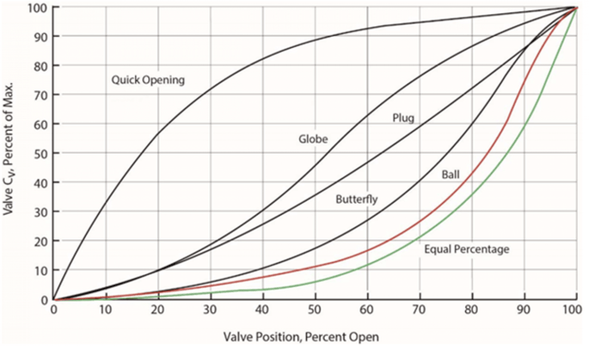 Controlling the flow rate involves the valve’s opening level and its equivalent valve Cv. This chart presents the characteristic curves of various types of valves like globe valves, ball valves, and more, which may give insight into the precision of control depending on the valve type.